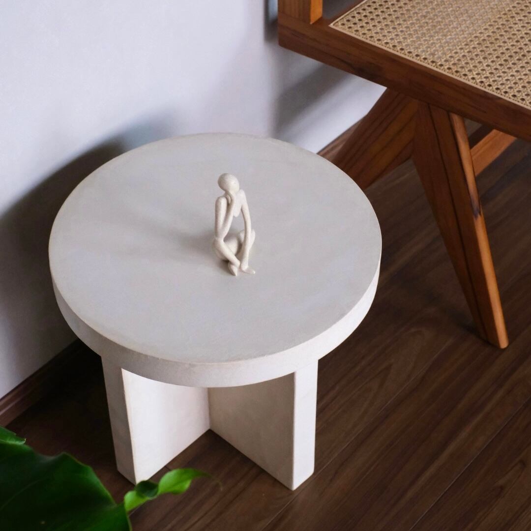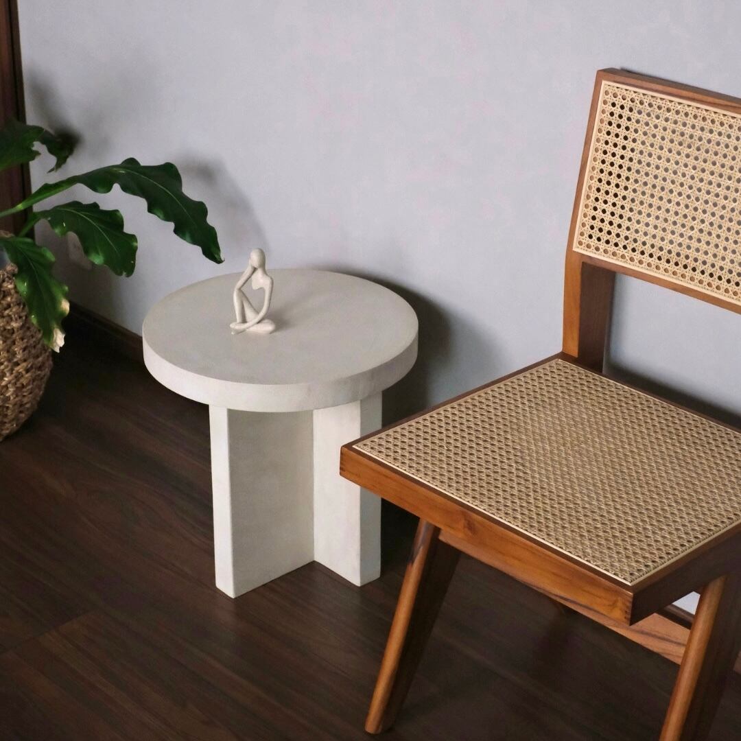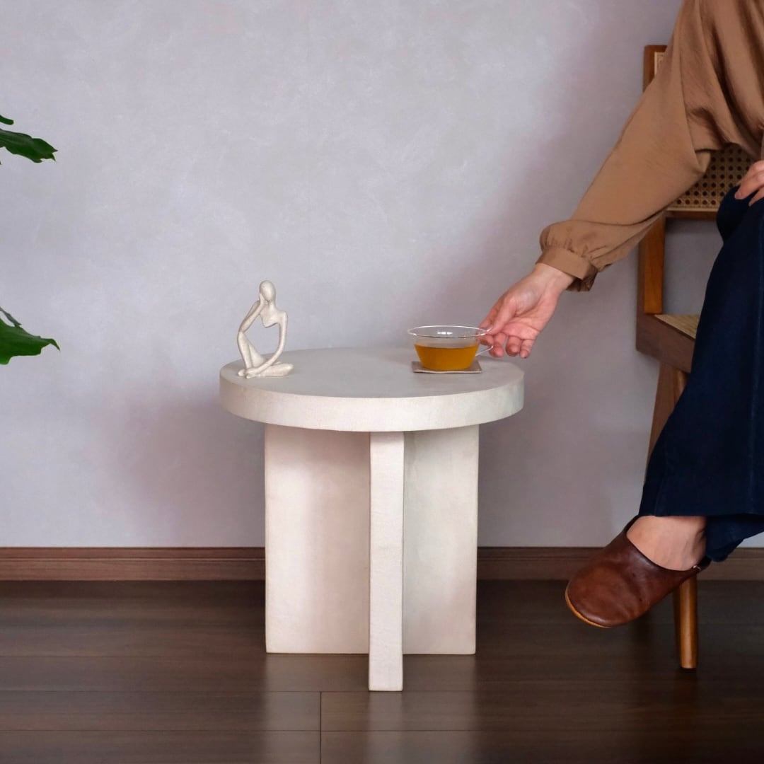 モールテックス製サイドテーブルです。丸型の天板を支えるアシンメトリーな脚のデザインはお部屋のインテリアにアクセントを加えます。置き方を変える事でデザインが違って見えるので、是非色々と試してお楽しみにいただきたいです。